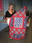 My quilting guild, Nimble Thimblers, has just completed our 2011 charity quilt project. This year we selected Wrapped Up in Sports, Inc. We completed 32 Boston team-related tee-shirt quilts and donated them to the non-profit organization, Wrapped Up in Sports, Inc. In the photo is the founder and president of WUIS, Inc., Kate McCullough, holding my “Yoooouuuuk!” quilt. Kate was kind enough to visit us at our meeting, tell us a little about her organization, about the recipient of our quilts, Hospitality Homes, and to pick up the quilts. This project was near and dear to my heart having attended WUIS annual quilt-a-thon last winter. Making quilts at the EMC Club in Fenway Park? Are you kidding? You do not have to ask me twice!