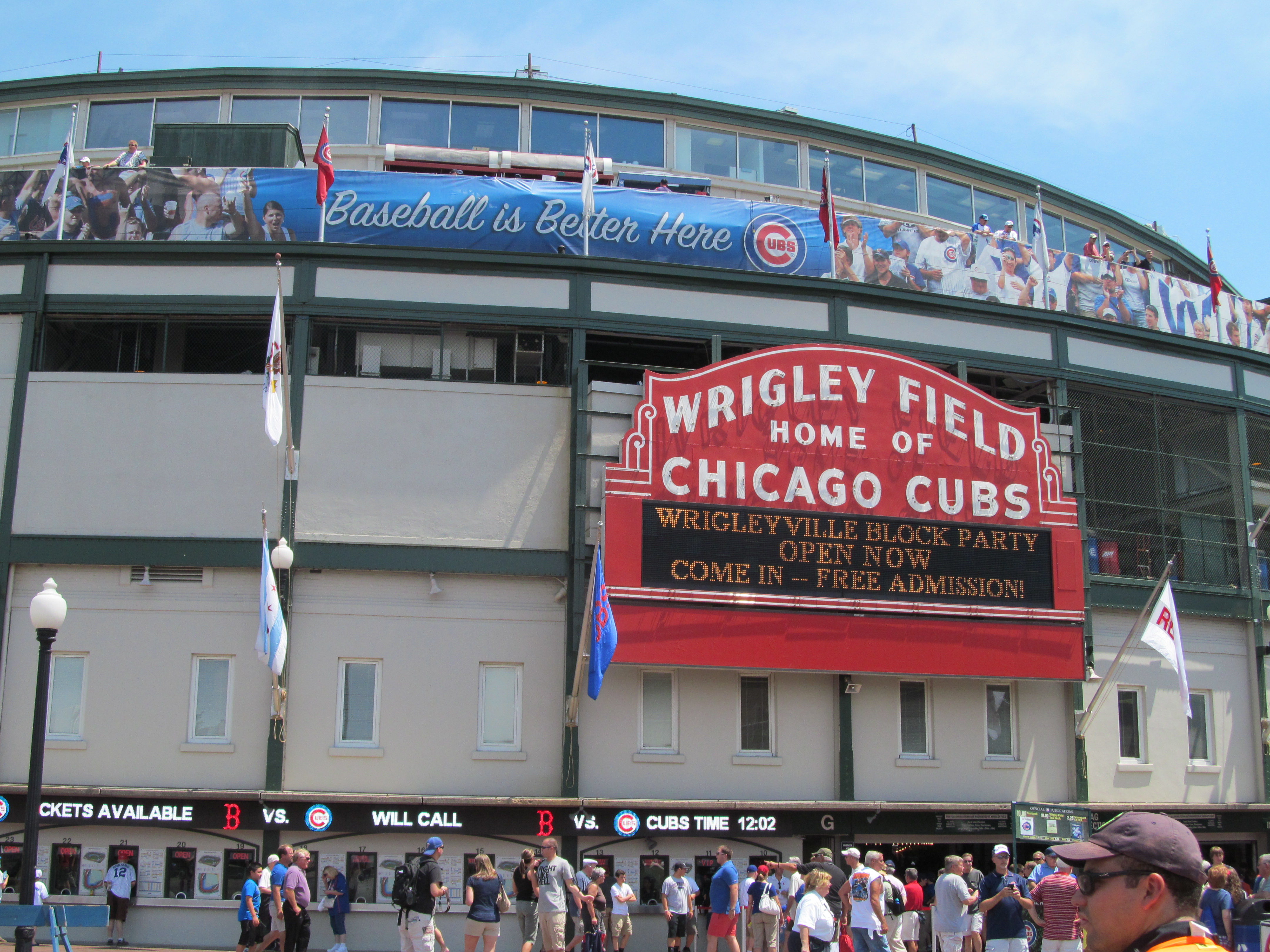 I had heard so much about Wrigley Field and how it compared to that other grand old lady, Fenway Park. The great wall of ivy where balls magically get lost was a lovely first impression. The closeness of the seats to the field had the same feeling as Fenway. One significant difference from Fenway was the roomy, comfortable seats with cup-holders in every section of the park! Yes, I said cup-holders at EVERY seat! Take note, John Henry. It is, after all, the little things in life that matter most. But Wrigley does not compare to Fenway. There is nothing like that breathtaking moment of walking up the ramp at Fenway.